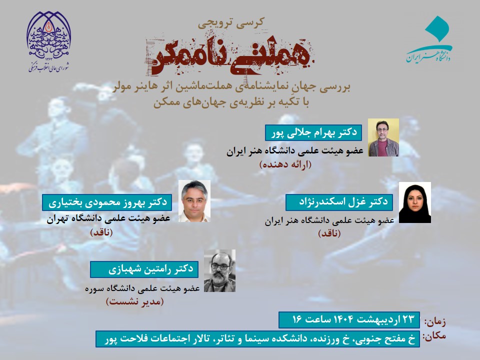 کرسی ترویجی هملتی ناممکن، بررسی جهاننمایشنامۀ هملتماشین، اثر هاینر مولر با تکیه بر نظریۀ جهانهای ممکن ۲۳ اردیبهشت ۱۴۰۴ | ۰۷:۲۱ کد : ۶۹۵۹ اخبار پژوهشی و فناوری ارسال به دیگران نام شما ایمیل شما ایمیل دریافتکننده ارسال انصراف تعداد بازدید:۶۳