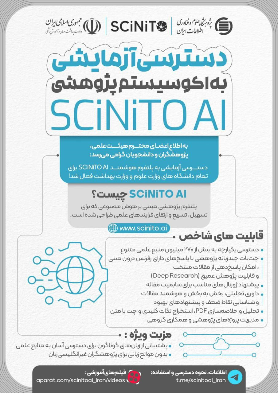 به اطلاع اعضای محترم هیأت علمی، پژوهشگران و دانشجویان گرامی میرساند دسترسی آزمایشی به پلتفرم پژوهشی SCiNiTO AI فعال شده است.