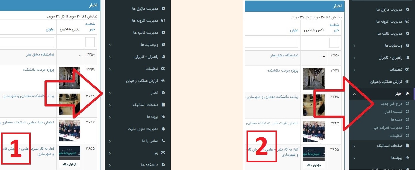 1 ابتدا از منوی سمت راست «اخبار» را انتخاب کرده و 2 پس از باز شدن زیرمنوها، بر روی گزینه «درج خبر جدید» کلیک کنید.