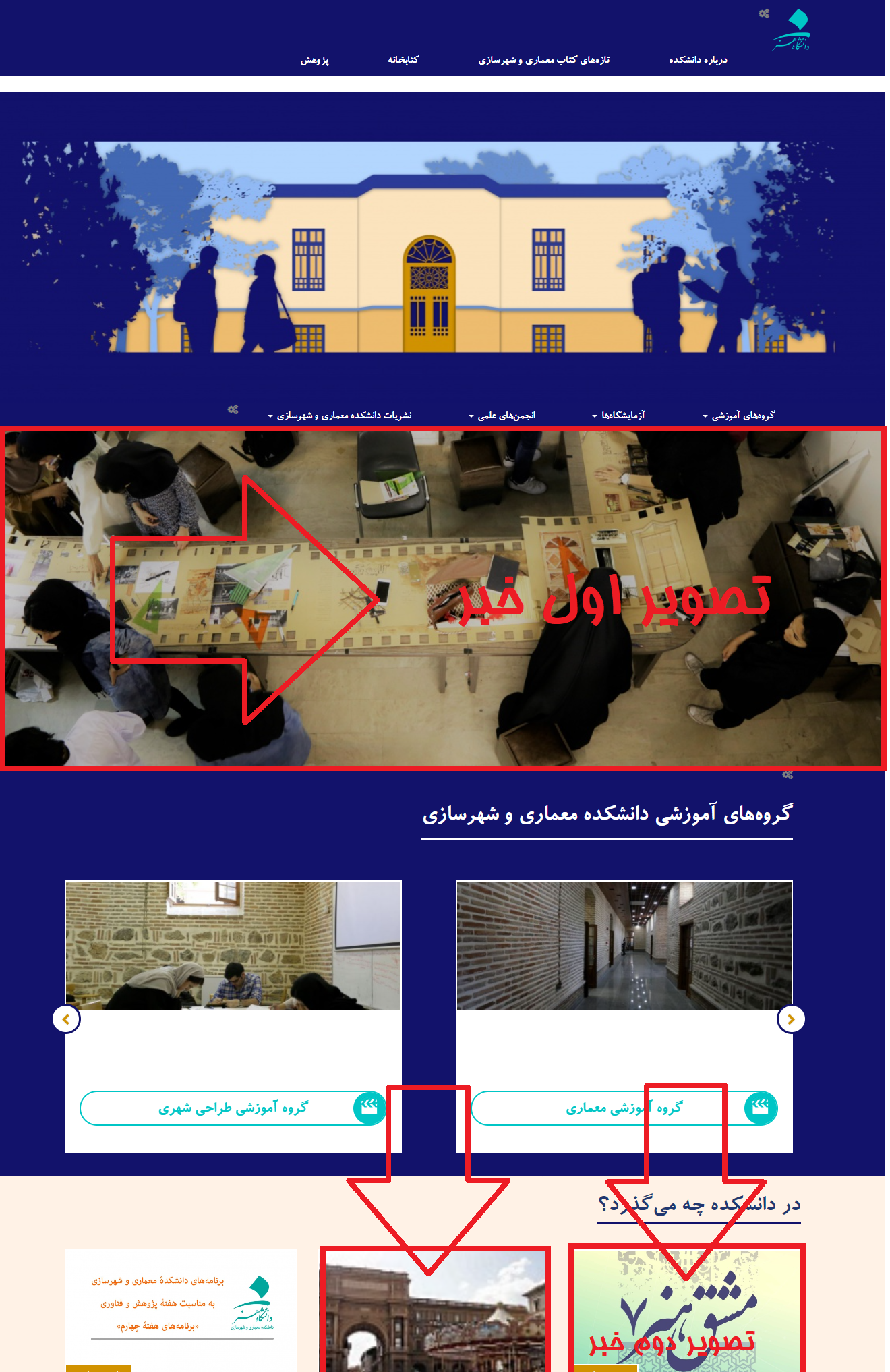 دسته اول با نام «تصاویر برگزیده» مطالبی را شامل میشوند که تاثیرگذاری بیشتری داشته و مدت زمان بیشتری بر صفحه دانشکده نمایش داده میشوند. دسته دوم اخبار با نام «در دانشکده چه میگذرد؟» خبرهایی را در برمیگیرند که دوام و تاثیر گذرایی دارند.