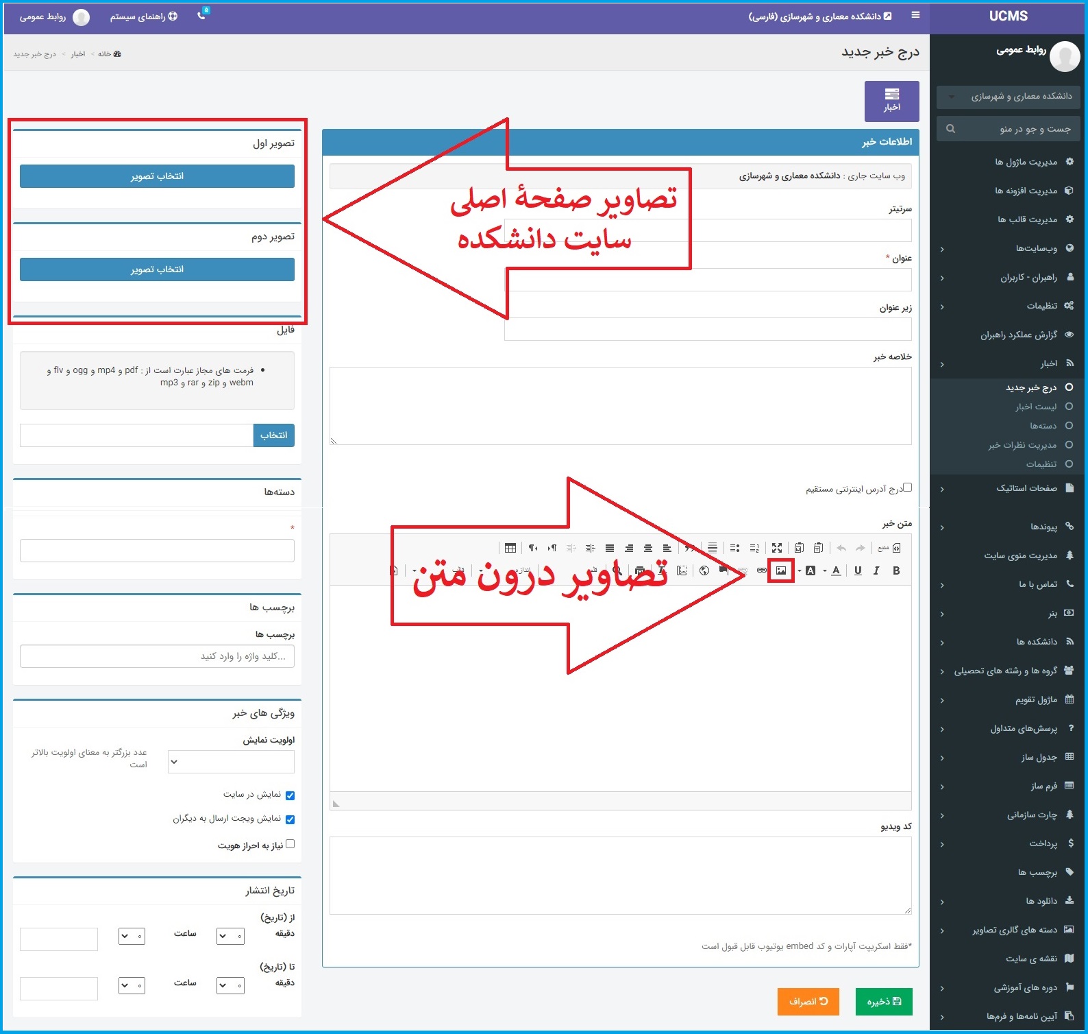چنانچه تصویری را در قسمت «تصویر اول» بارگذاری شده و در قسمت دسته خبر «تصاویر برگزیده» را انتخاب کنید، تصویر خبر در بالای سایت نمایش داده خواهد شد و چنانچه تصویری را به عنوان «تصویر دوم» بارگذاری کنید، با انتخاب گزینه «در دانشکده چه می‌گذرد؟» در قسمت دسته خبر، تصویر بارگذاری شده در قسمت «در دانشکده چه می‌گذرد؟» نمایش داده خواهد شد.