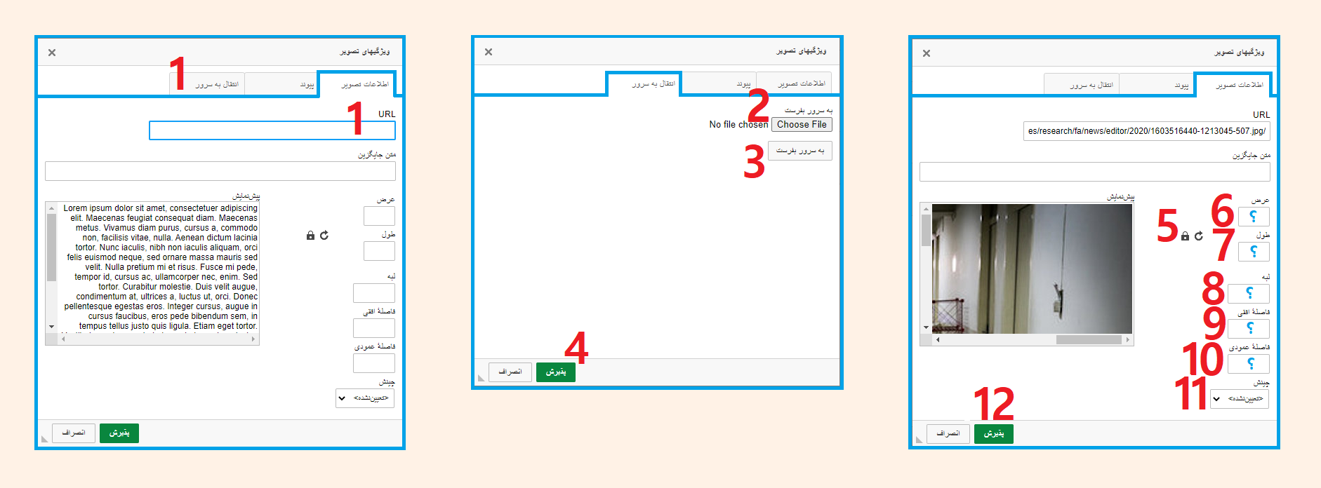 پس از اتمام فرایند بارگذاری تصویر بصورت خودکار به سربرگ اطلاعات تصویر منتقل می‌شوید. در این قسمت قادر به ویرایش نحوه نمایش تصویر خود در صفحه خواهید بود.
